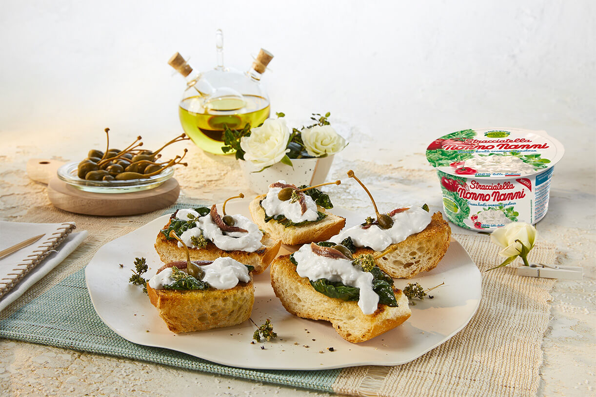 Blanch the spinach in plenty of salted water. When it is cooked, sauté in a frying pan with a little oil, salt and pepper. Cut the baguettes in half, drizzle with a little oil and warm on a griddle. Spread the spinach on the bread, add the Nonno Nanni Stracciatella and garnish with anchovies as preferred.