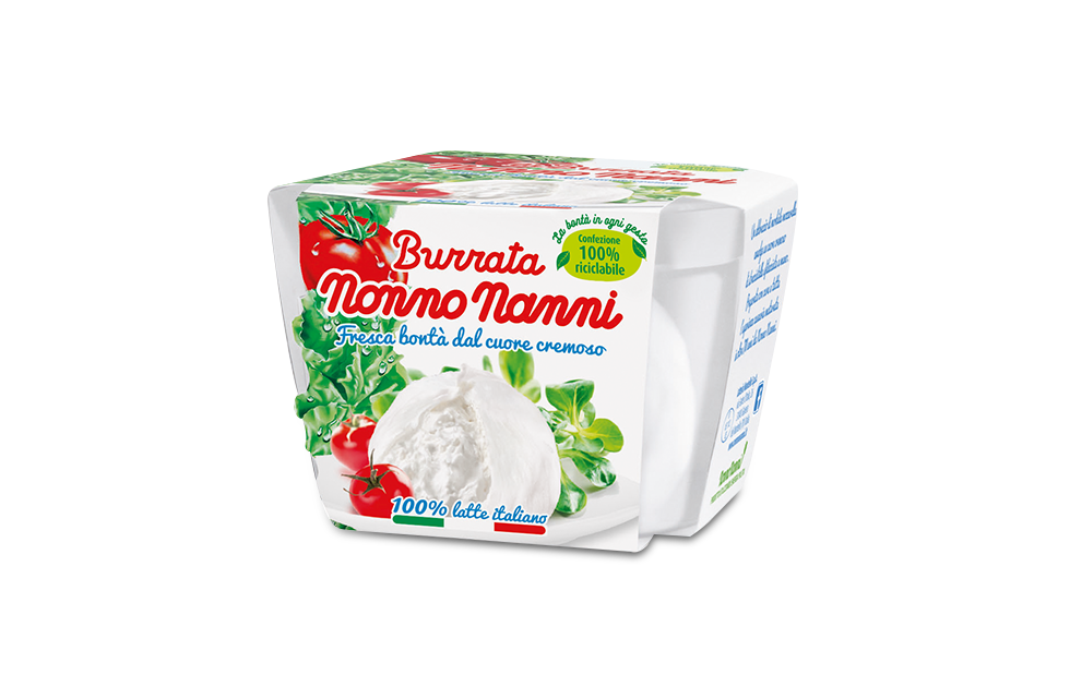 De la rencontre entre une longue tradition fromagère et une matière première d'excellence ne pouvait naître qu'une exquise nouveauté. La Burrata Nonno Nanni, fabriquée avec du lait 100% italien et sans conservateurs, est un produit unique, fabriquée avec soin, qui promet un plaisir doux et enveloppant. Une moelleuse mozzarella vient enrober un coeur onctueux de stracciatella et l'ensemble offre une expérience gustative unique.