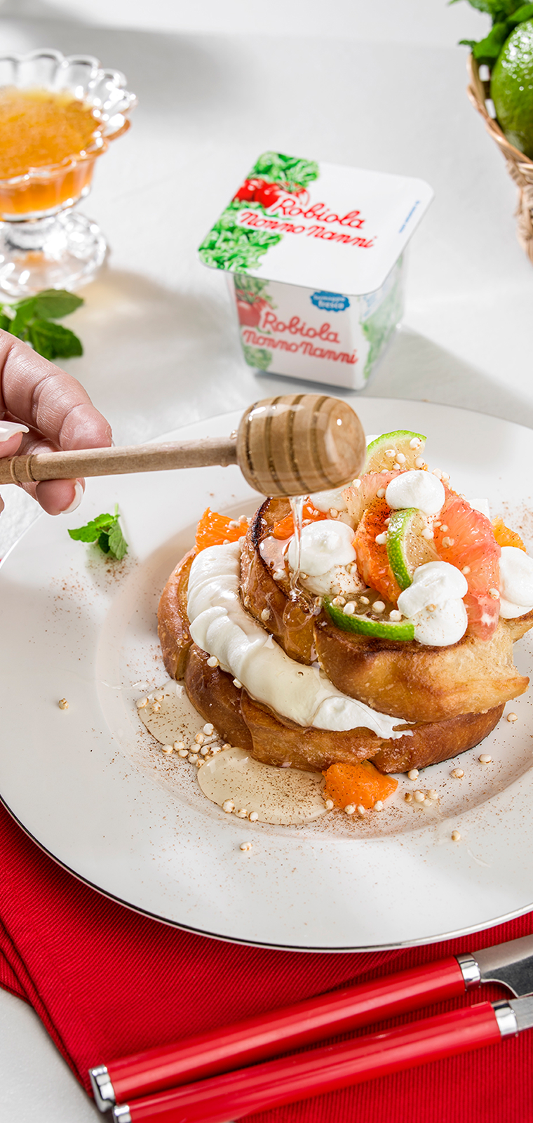 Toast dolce con cannella, agrumi, robiola, miele e quinoa soffiata